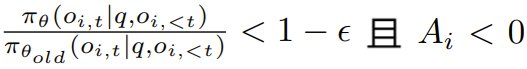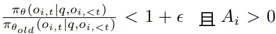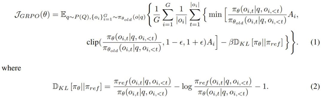 其中,q 是从数据集分布 P (Q) 中采样的问题,{o_1, o_2, ... , o_G} 是 G 个完成结果,π_θ 是策略模型,π_θ_old 是旧策略模型,π_θ_ref 是参考模型,ϵ 和 β 是超参数,A_i 是使用一组奖励 {r_1, r_2, ... , r_G} 计算的优势。
