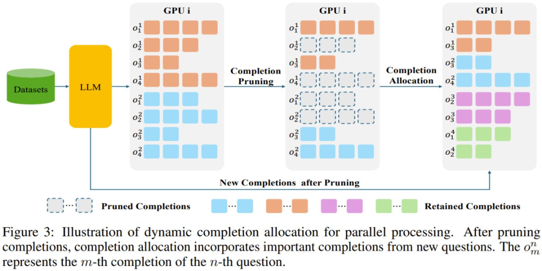 此外,他们还观察到,由于完成剪枝会导致 GPU 资源利用率不足,从而导致资源浪费。为了解决这个问题,他们引入了一种动态完成结果分配策略。该策略会用新问题的完成结果填充每个设备,从而充分利用 GPU 资源并进一步提高训练效率。