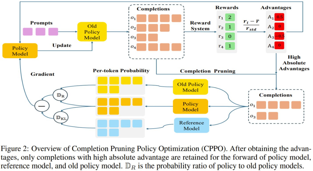 顾名思义,CPPO 会根据优势对完成结果进行剪枝,这样一来就可以提升强化学习过程的速度。