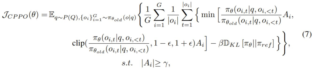 相比于 GRPO,CPPO 引入了一个选择性条件,该条件仅会包括表现出足够高优势的完成结果。CPPO 的目标公式如下: