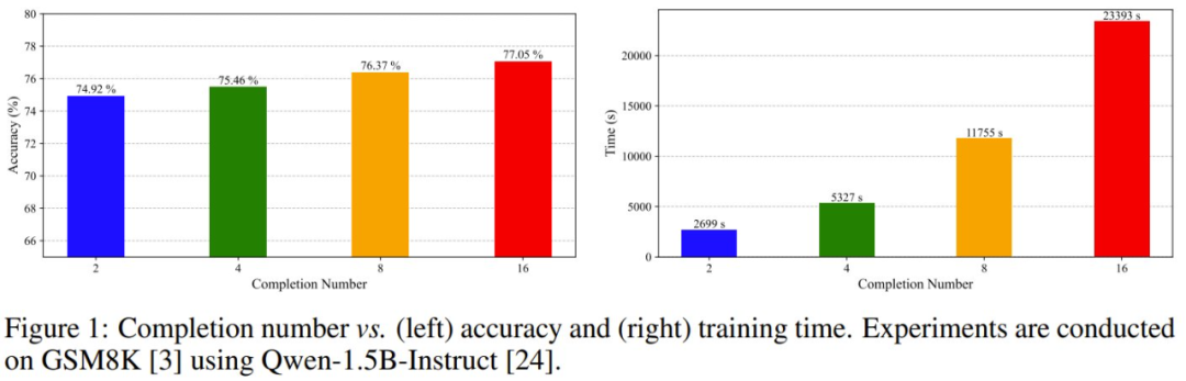 近日,厦门大学纪荣嵘团队研究发现,每个完成结果的贡献与其相对优势有关。也就是说,每个完成结果对策略模型训练的贡献并不相等。如图 1 所示,完成结果的数量增大时,准确度提升并不非常显著,但训练时间却会迅速增长。
