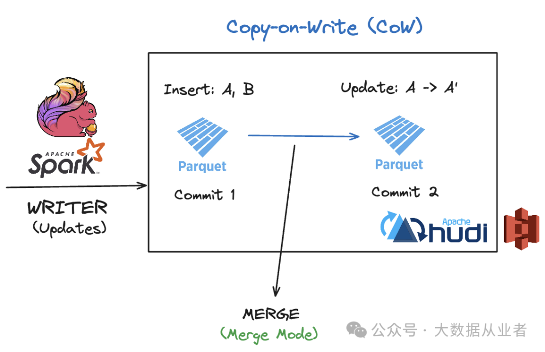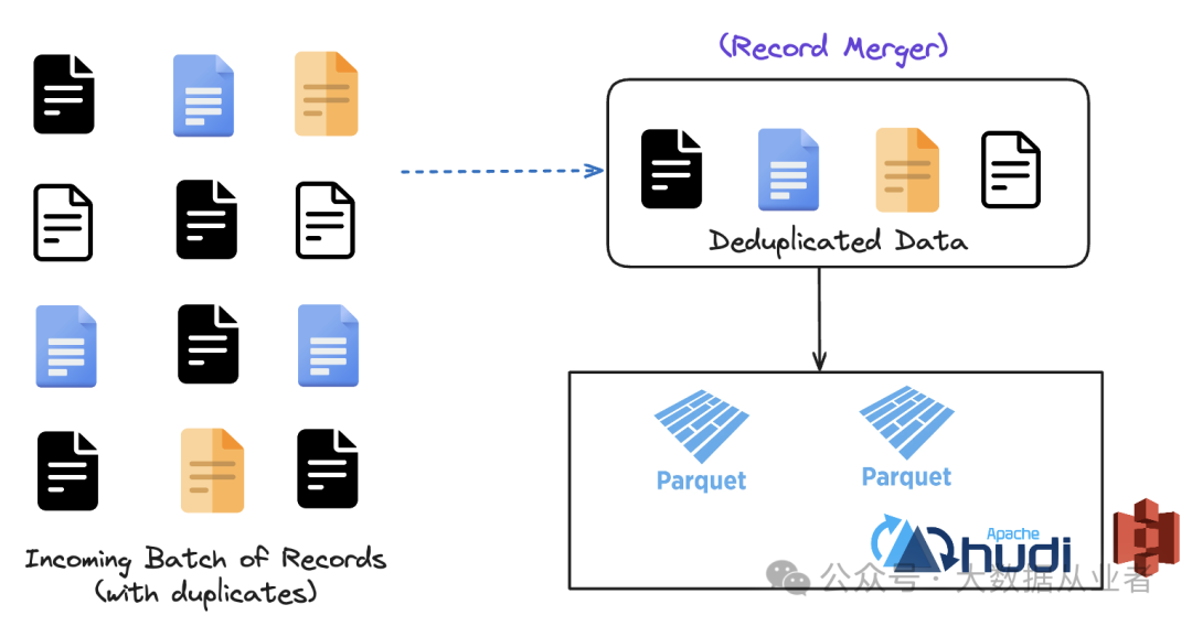 在将记录合并到存储时,Hudi采用先进的合并算法,即记录合并器,以确保数据一致性并消除重复数据。由于湖仓使用不可变的文件格式(如 Parquet)来存储记录,任何更新或删除操作都需要创建包含最新更改的文件新版本(写时复制)。