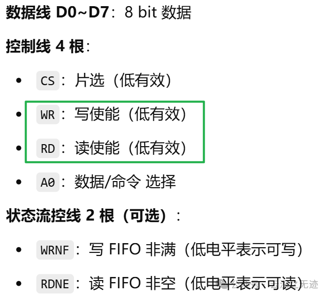 14个IO,因为地址就在这里,所以这个总线就没有地址线了,因为数据量大,所以有个FIFO。时序就不写了,没人在乎。