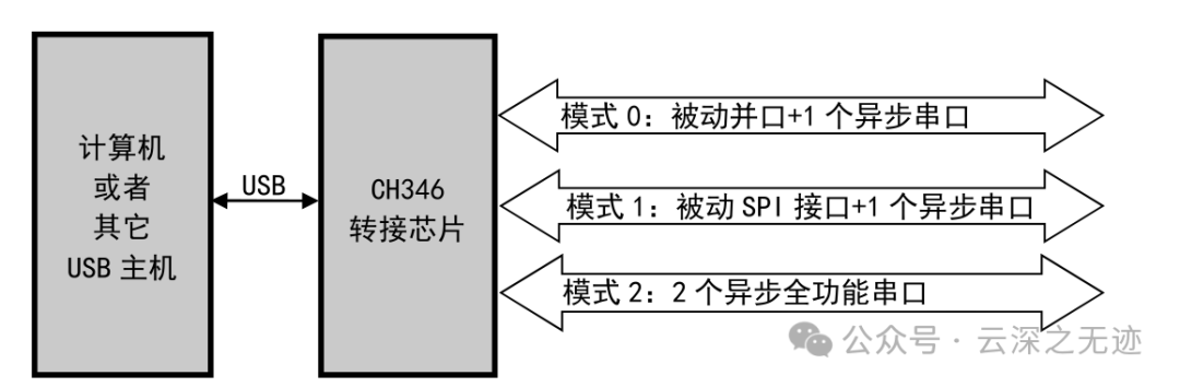 主控(如 MCU)为 SPI 主机,CH346 为从机,提供高速 SPI 数据桥接 USB。