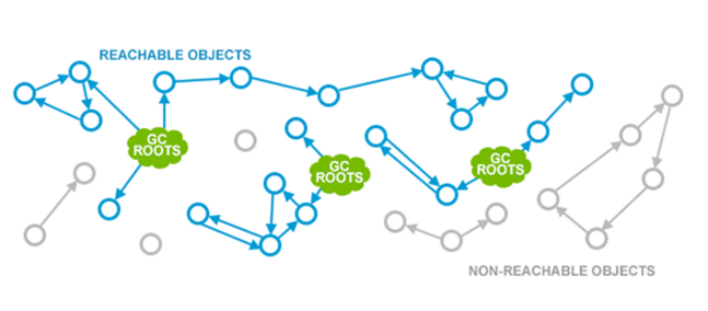 根搜索算法是从离散数学中的图论引入的,程序把所有的引用关系看作一张图,从一个节点GC ROOT开始,寻找对应的引用节点,找到这个节点以后,继续寻找这个节点的引用节点,当所有的引用节点寻找完毕之后,剩余的节点则被认为是没有被引用到的节点,即无用的节点。