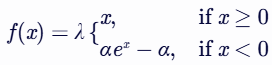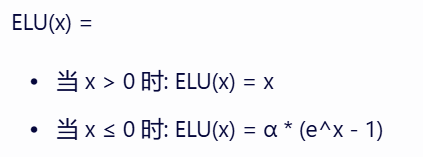 这个公式表示,当输入 x 大于 0 时,ELU 函数返回 x 本身(与 ReLU 函数相同);但当 x 小于或等于 0 时,ELU 函数会返回一个指数函数与 α 的乘积再减去 α 的值。这种设计使得 ELU 函数在输入为负时仍有一定的输出,而不是像 ReLU 函数那样直接输出 0,从而有助于缓解“死亡ReLU”问题。