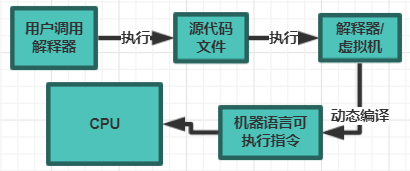 (二)解释型语言: Python,Ruby,PHP,JavaScript,Shell等。相当于随身携带一个翻译官,等同于现在的“同声翻译”。首先用户调用解释器,执行源代码文件。然后解释器把源代码文件边解释成机器语言,边给CPU执行。执行过程如图: