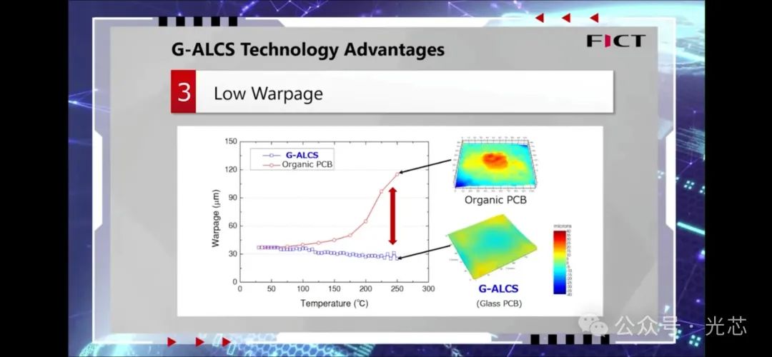 G-ALCS的第三个优势是即便在高温环境下也能够抑制基板翘曲。通过对采用G-ALCS技术的有机基板和玻璃基板之间的翘曲测量结果进行了对比,在整个温度变化过程中,G-ALCS几乎能保持与初始状态一致,这在提高可安装性方面是一项显著优势。
