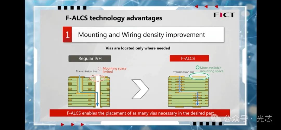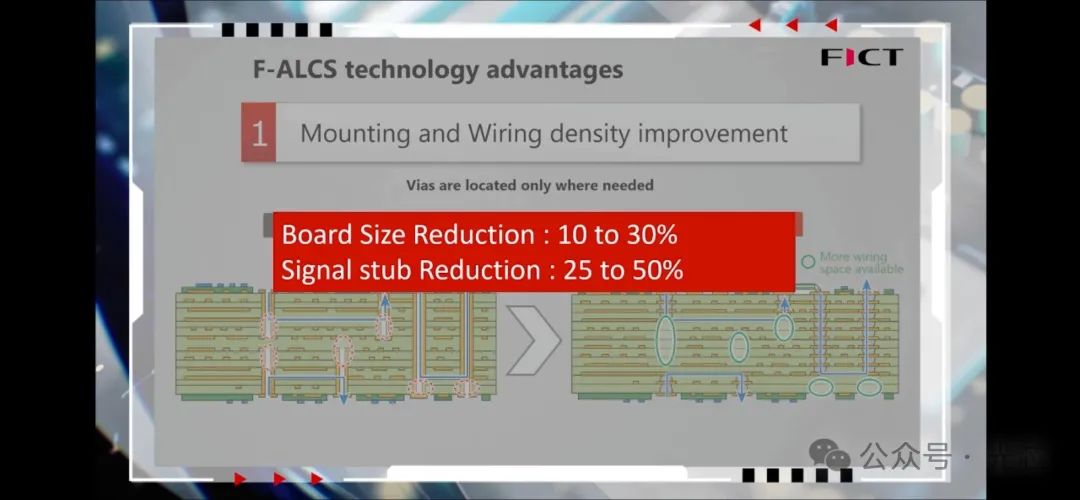 这里有一个对比,左边是常规的内埋通孔(IVH)印制电路板结构,右边是F-ALCS印制电路板结构。常规的内埋通孔(IVH)印制电路板必须要有镀通孔(PTH),而这会限制安装空间。相比之下,F-ALCS技术通过仅在必要的层上设置过孔,解除了安装空间的限制。在常规的内埋通孔(IVH)结构中,要创建过孔就不可避免地会产生布线限制的问题,因为需要钻孔。而通过应用F-ALCS技术,可以在将所有层粘贴在一起之前就在每层上设置过孔。这种方法有助于避免内部结构中不必要的过孔,从而提高布线密度。F-ALCS技术能使电路板尺寸缩小10%到30%,并减少25%到50%的信号短截线。