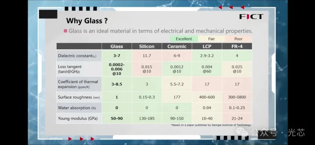 正如表中所示,玻璃的介电损耗角正切明显低于其他材料,这在高速传输方面是一项显著优势。此外,玻璃材料的热膨胀系数处于百万分之3至8.5的范围,这使其在可安装性方面极具优势。