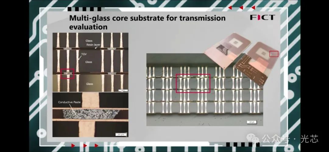底下的横截面图展示了一个实际的基板,它是利用G-ALCS技术通过将四层玻璃层压形成一个八层多层玻璃结构而制成的。首先在每层玻璃上形成玻璃通孔(TGV),然后将所有层堆叠起来,利用导电膏和树脂层打造出了一个多层玻璃芯。