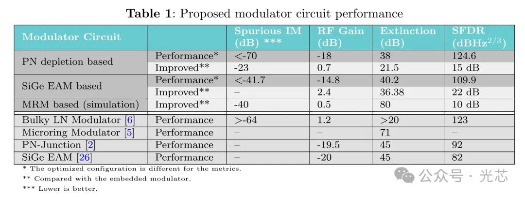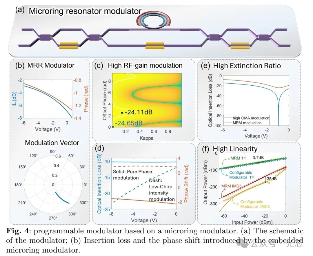 SiGe EAM的强度响应非线性,可编程调制器可改善线性度。实验显示,系统的SFDR可提升至110 dBHz^{2/3} ,比独立的SiGe EAM(偏置在0.5V时为88 dBHz^{2/3} )高约22dB。在其他测试中,偏置在1V时,EAM的SFDR可从102.8 dBHz^{2 / 3} 提升至112.5 dBHz^{2/3} ;偏置在2V时,可从109 dBHz^{2/3} 提升至114.5 dBHz^{2/3} ,相比此前报道结果,线性度优化效果更好。 ③ 微环调制器 微环调制器(MRM)在硅光子平台应用广泛,具有尺寸小、功耗低、带宽高的优势,但只能在谐振波长附近工作,且强度调制非线性。本文通过提取在imec iSiPP50G平台上制造的MRM的直流响应,建立准静态模型,模拟其嵌入可编程调制器后的射频响应。
