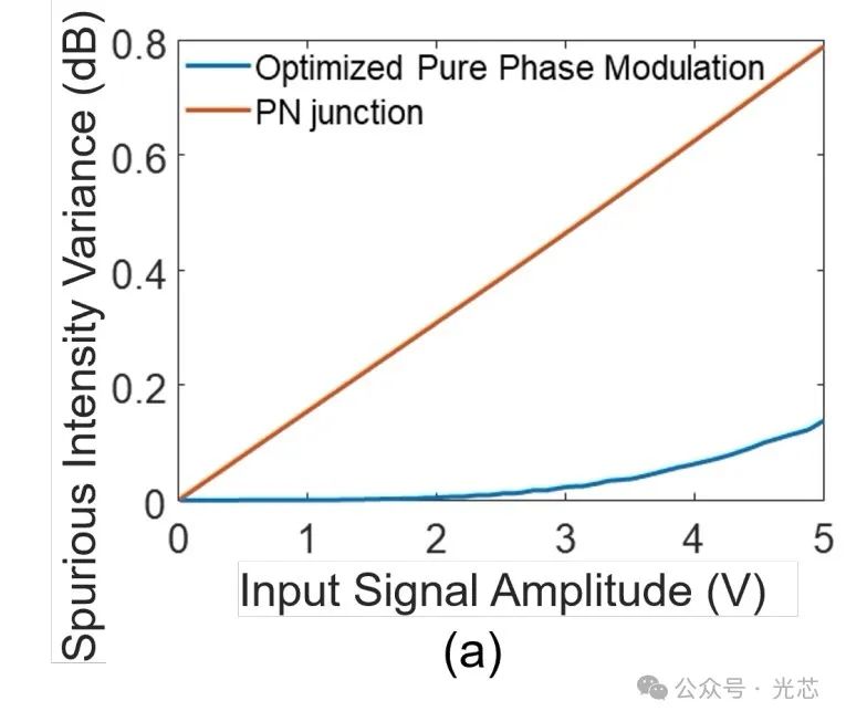 MRM的强度调制会伴随相位调制,导致调制光信号产生频率啁啾。设置可编程调制器参数,在6V偏置范围内,可将相位变化从0.36rad降至0.11rad,强度变化从4.05dB提升至11.33dB,但在MRM偏置为0V时,插入损耗会增加5dB。 - 纯相位调制: