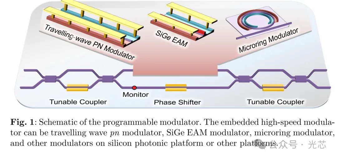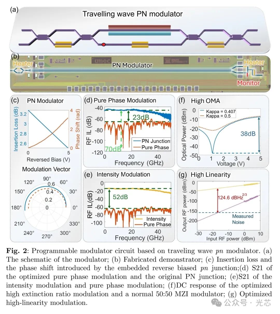 ◆引言 在集成光子系统中,电光调制器(E/O Modulator)是光通信、微波光子学、LiDAR等领域的核心器件,其性能直接决定了系统的带宽、线性度与动态范围。然而,传统调制器(如基于载流子耗尽的pn结调制器、微环调制器MRM、SiGe电吸收调制器EAM)受限于物理机制与工艺缺陷,往往在强度调制(IM)与相位调制(PM)之间难以兼顾,且存在非线性失真、插入损耗高、波长敏感性等问题。例如: - pn结调制器:相位调制伴随寄生强度调制(Spurious IM),导致信号失真; - MRM:高带宽但波长敏感,且响应为非线性Lorentzian曲线; - SiGe EAM:紧凑但调制效率低,消光比不足。 针对这些挑战,根特大学团队提出了一种电路级可编程调制器设计,通过将现有调制器嵌入可调谐马赫-曾德尔干涉仪(MZI)中,通过调整该MZI的静态传输响应,可以补偿嵌入式调制器电光响应中的缺陷,根据应用需求实现改进的调制响应曲线、更低的插入损耗、更高的调制效率或更高的无杂散动态范围。如果嵌入式调制器组件可以提供较大的相位调制,可编程调制器电路可以调整为作为强度调制器、相位调制器,或者两种调制方式的组合来工作。实验表明,该设计在SFDR(无杂散动态范围)、消光比、线性度等关键指标上均突破现有记录。