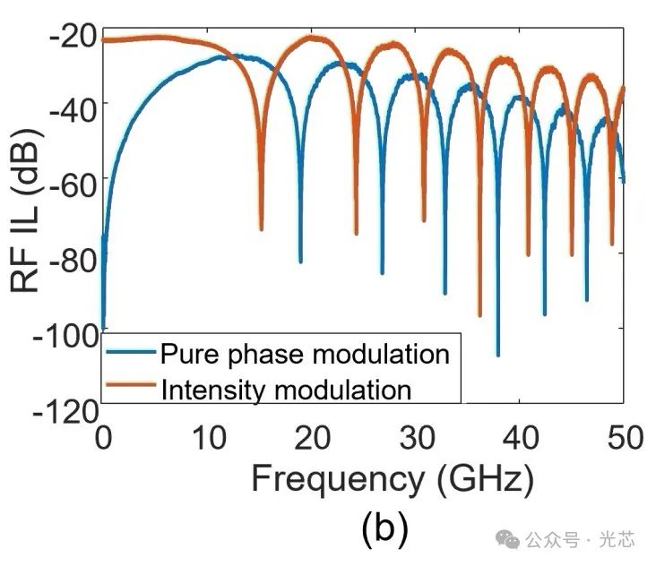 在特定配置下,可编程调制器能实现纯相位调制,但标准PD无法直接检测光的相位变化。本文利用25km光纤的色散创建双抽头微波光子滤波器验证。结果显示两个滤波器响应交错,证实可编程调制器可作为具有可调消光比的宽带射频滤波器,最大消光比可达80dB。 ③ 光程匹配