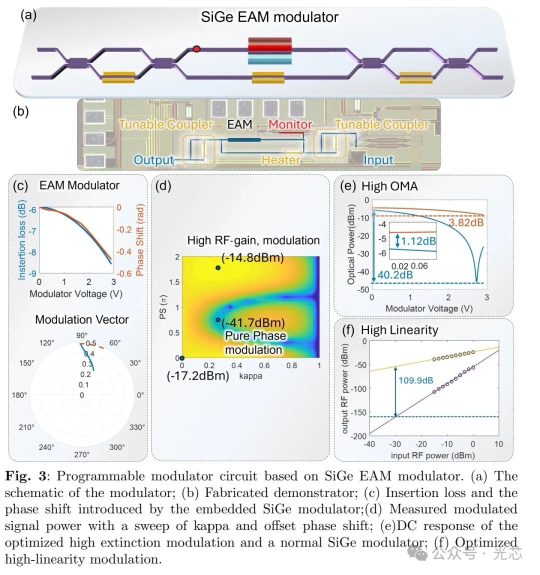 独立的pn结具有非线性的相位和杂散强度响应,且通过MZI将相位调制转换为强度调制的方式本身也具有非线性。可编程调制器电路通过两者结合互补抵消这两种非线性源,显著线性化强度调制响应。以无杂散动态范围(SFDR)评估调制器线性度,当可编程调制器选取合适的配置,在2GHz调制频率附近,SFDR达到124.6 dBHz^{2/3} (本底噪声为−160.4dBm/Hz),与此前报道的最高线性度硅基调制器以及体材料的LiNbO3 调制器性能相当,且系统更简单。 ② SiGe EAM调制器