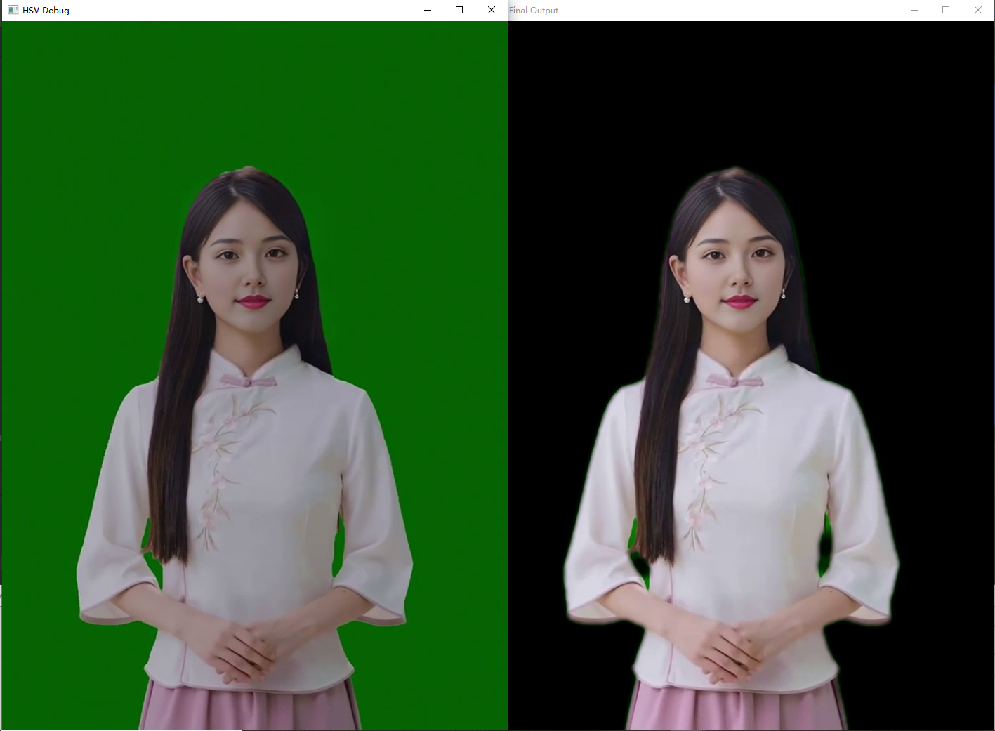 )说明:一段mp4绿幕背景视频,我想替换为其他背景图,第一步抠图的时候发现结果边缘还有绿色虚线