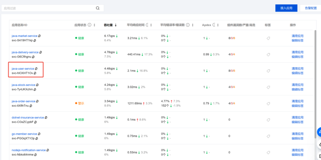 通过 APM 提供的告警能力,用户发现微服务架构中部分应用存在异常。在 APM 控制台中,能够清晰地获取每个应用的健康状态,以及吞吐量、响应时间、错误率等关键性能指标。其中部分应用表现为较高的响应时间,以及远超预期的调用错误率。