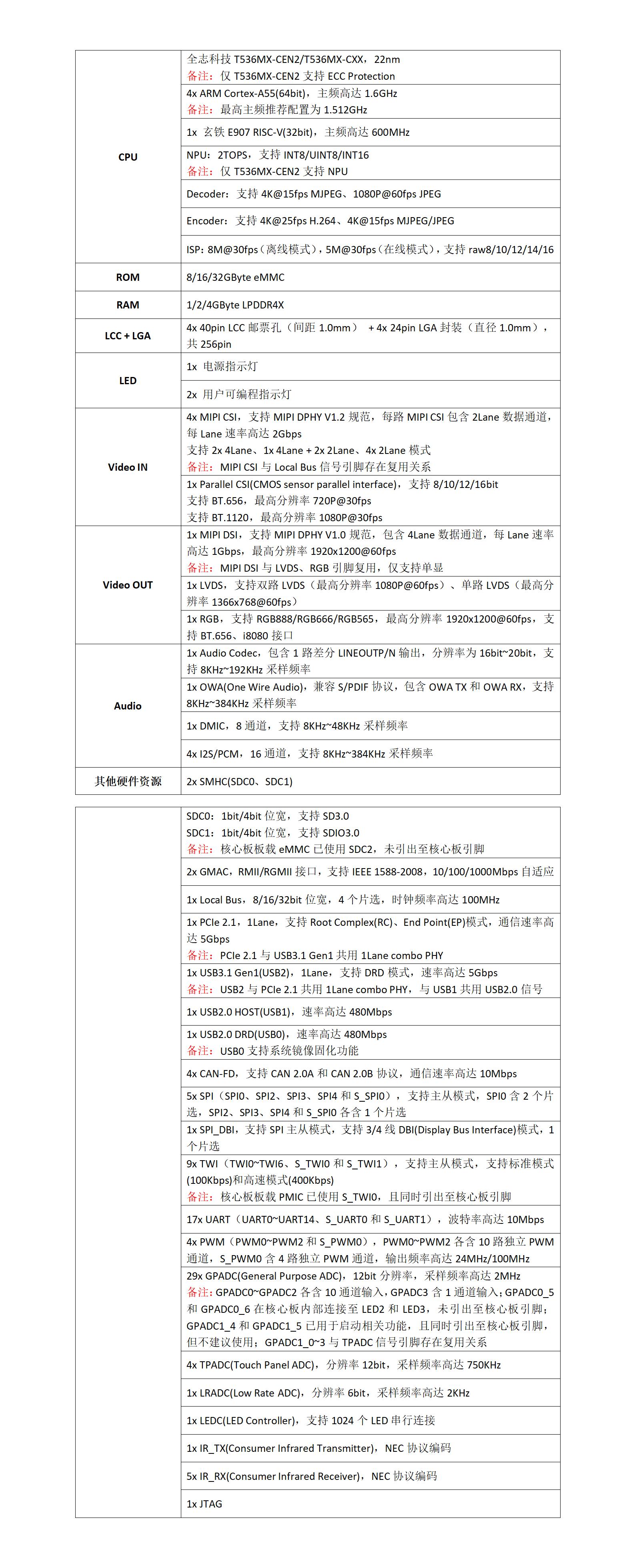 核心板通过邮票孔(LCC) + 平面网格阵列(LGA)连接方式引出17x UART、4x CAN-FD、2x GMAC、Local Bus、USB3.1/PCIe 2.1、2x USB2.0、6x SPI、LVDS Display、RGB Display、MIPI DSI、4x MIPI CSI、Parallel CSI等接口,内置2TOPS NPU、8M@30fps ISP,并支持4K@25fps H.264视频编码。核心板经过专业的PCB Layout和高低温测试验证,支持选配屏蔽罩,质量稳定可靠,可满足各种工业应用环境要求。