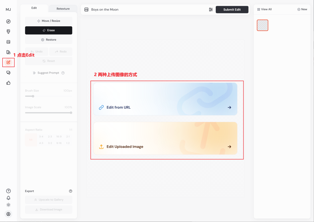 进入Midjourney的网页版,图像编辑器的界面如下:
