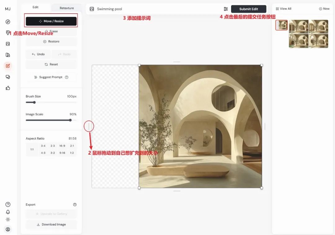 另一个功能是改变图片大小做自动填充。这个其实Midjourney之前也有,只不过当时是固定的一些倍数,而现在更加的自由,可以扩展任意方向,任意像素。