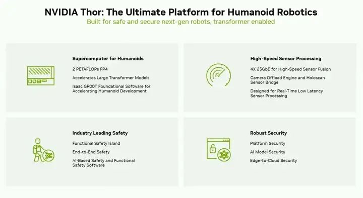 它被设计为人形机器人的终极平台,专为通过边缘Transformer模型加速的安全下一代机器人打造。Thor包含四大核心支柱:
