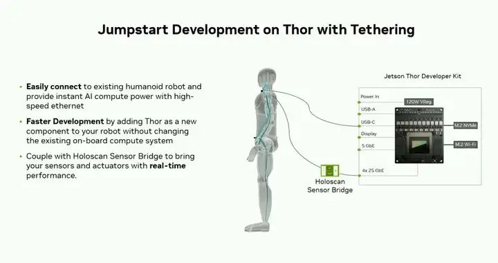 在快速启动开发方面,我们发现客户在集成过程中有时需要额外时间。因此,我们不希望您必须等到完全集成后才能开始开发。通过我们的Thor平台,我们从I/O接口和接线设计两个维度优化了开发者套件,使您能轻松将其绑定到现有系统中。您也可以将传感器桥接模块(Sensor Bridge)加入系统,连接新传感器,从而立即开始开发。