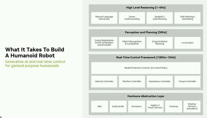 -实时控制脑:专注于低延迟控制框架(如速度、位置、扭矩控制),需100Hz-1kHz控制频率,确保机器人稳定不摔倒