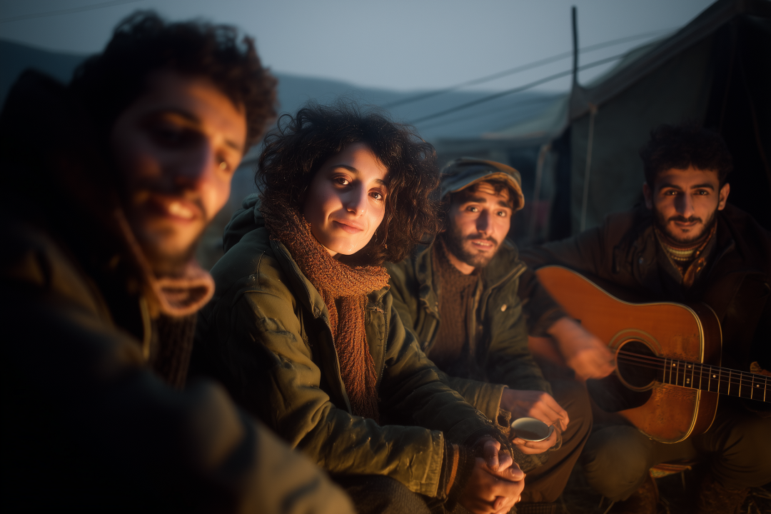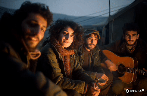 Prompt是这样的:五人围坐篝火旁,女子抬头微笑看向镜头,身旁男子弹吉他,画面外的人递茶给她,她接过来吹了吹,大家交谈轻笑,火光映出脸庞,镜头不动。
