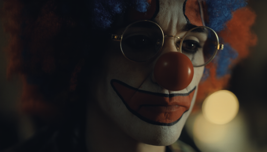电影质感,特写镜头,一位年轻女小丑的脸部,带有红色大鼻子、红色腮红妆容,眉毛浓密,戴着圆形金丝眼镜,头发是红蓝相间的蓬松卷发假发,表情严肃、带有内敛的悲伤感,皮肤细腻,细节写实,光影浓郁,整体氛围昏暗、具有电影感和戏剧张力,背景虚化,焦点集中在眼神和面部表情上。