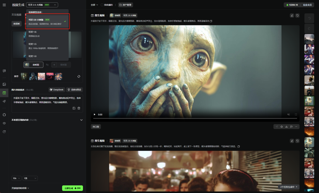 你就能在视频生成的tab里,看到可灵2.0大师版了。