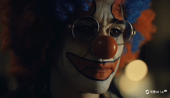 我生视频的prompt是这样的:小丑妆女孩定格凝视镜头,眼神冷静中透出疲惫,镜头缓慢后拉,微微抖动聚焦眼神,他轻轻摘下眼镜,嘴角抽动仿佛想笑,最终眼神低垂不语,气氛压抑克制,镜头暗转隐入阴影。