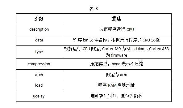 Cortex-M0(MCU)核心Baremetal/RT-Thread(RTOS)案例的配置文件为amp.its,Cortex-A53(CPU3)核心Baremetal/RT-Thread(RTOS)案例的配置文件为amp_linux.its,此文件均位于Baremetal/RT-Thread(RTOS)案例Image目录下,负责描述打包生成amp.img镜像的配置信息。在U-Boot启动后,读取amp.img并解析amp.img中的配置信息,然后根据配置信息加载Baremetal、RT-Thread(RTOS)程序到指定内存地址,并启动Cortex-M0/Cortex-A53核心运行程序。