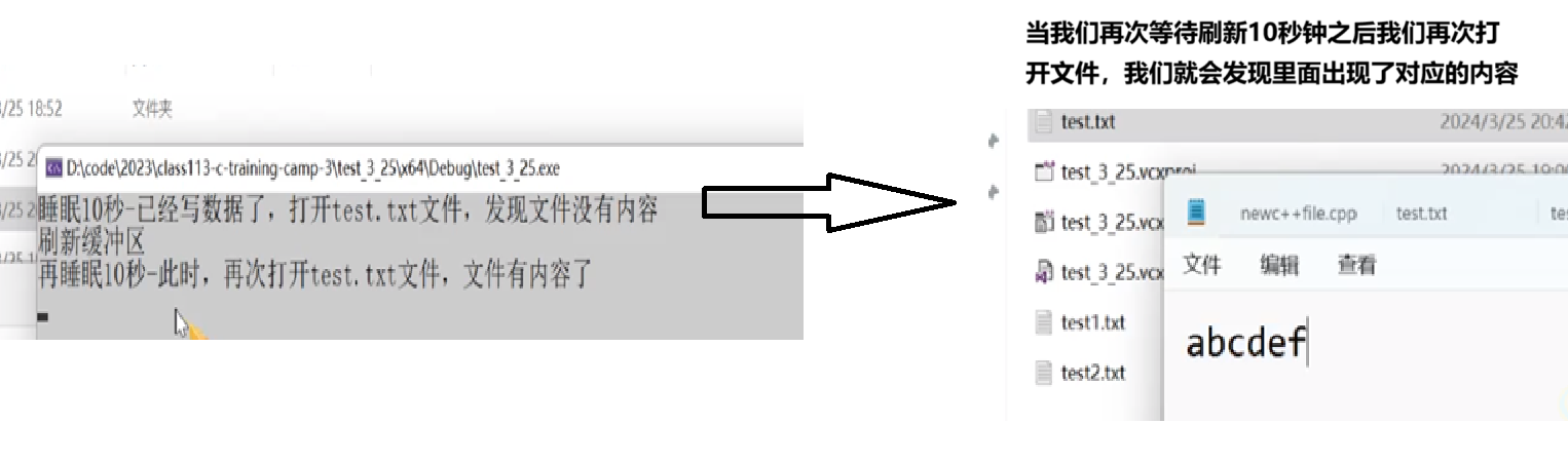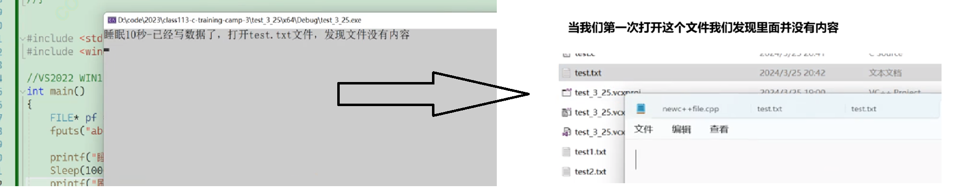 printf("睡眠10秒-已经写数据了,打开test.txt⽂件,发现⽂件没有内容\n");