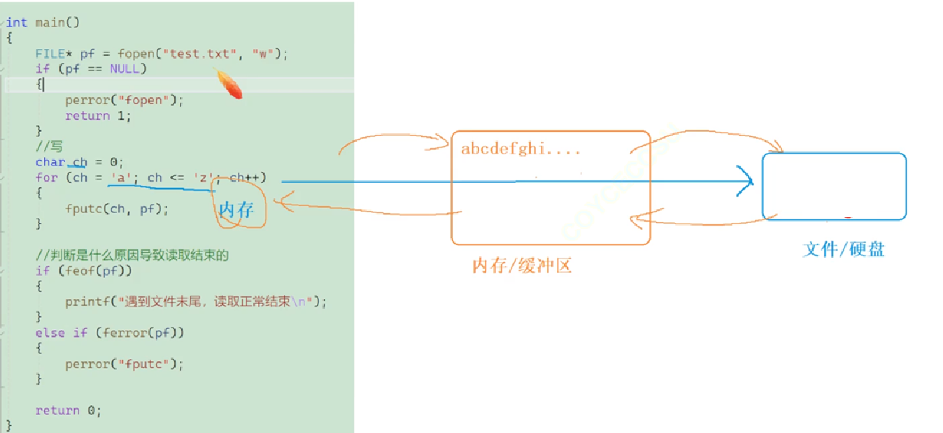 fputs("abcdef", pf);//先将代码放在输出缓冲区