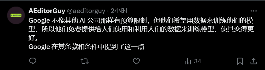 至于谷歌免费提供的原因,猜测:一是利用庞大用户群收集数据以训练和改进模型(部分用户指出谷歌 T&C 中有提及);二是谷歌拥有强大的 TPU 基础设施,成本相对较低。(谷歌:我有 TPU)