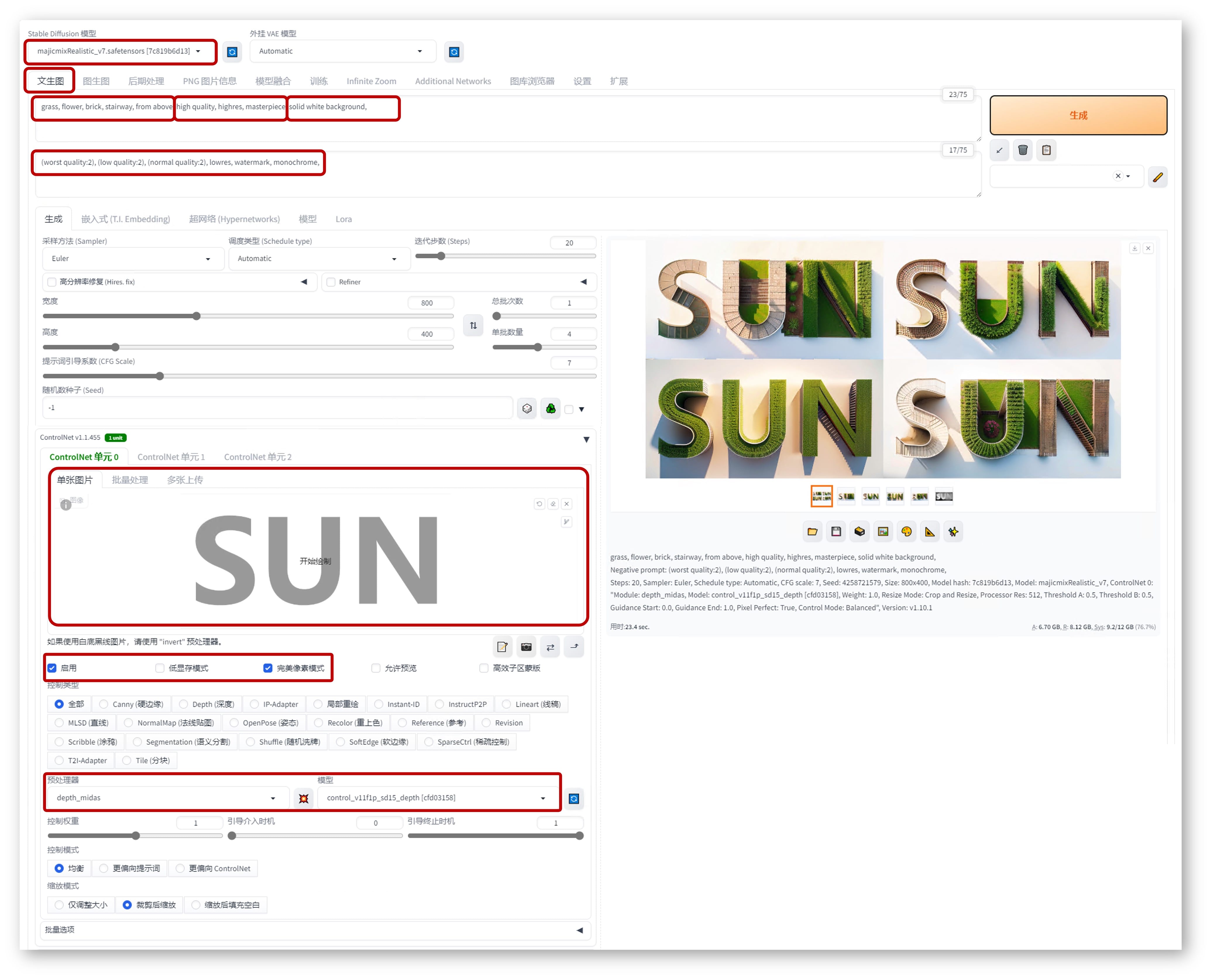 核心思路: 使用 ControlNet + 提示词生成AI材质艺术字,效果图见后。