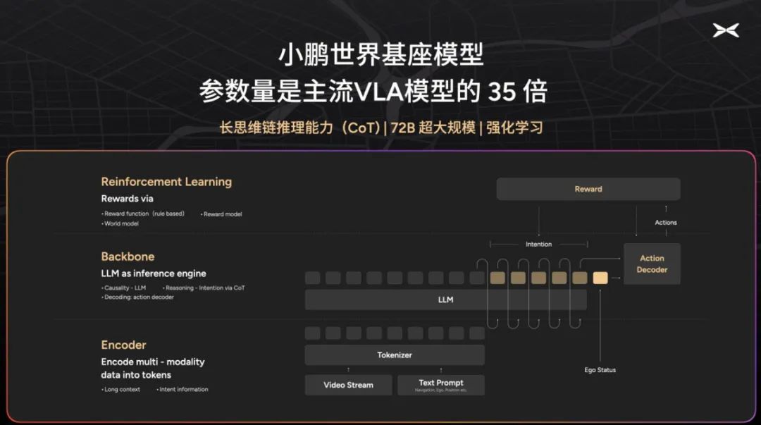 小鹏发展的云端世界基座模型以大语言模型为骨干,使用海量的优质多模态驾驶数据进行训练,具备视觉理解、链式推理和动作生成能力。通过强化学习训练,其基座模型可以不断自我进化,逐步发展出更全面、更拟人的自动驾驶技术。