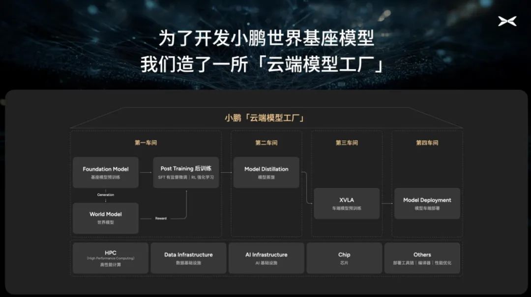 小鹏汽车自动驾驶负责人李力耘表示,小鹏早在去年就开始布局 AI 基础设施,建成了国内汽车行业首个万卡智算集群,用以支持基座模型的预训练、后训练、模型蒸馏、车端模型训练等任务,小鹏将这套从云到端的生产流程称为「云端模型工厂」。