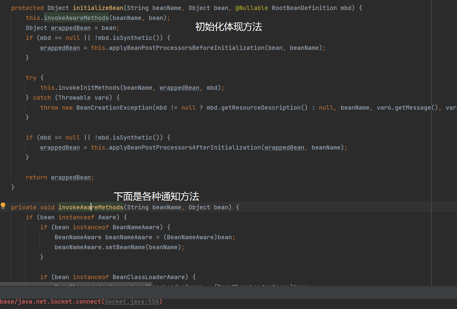 执行各种通知,在AutowireCapableBeanFactory接口中有定义AbstractAutowireCapableBeanFactory和AbstractBeanFactory方法中实现
