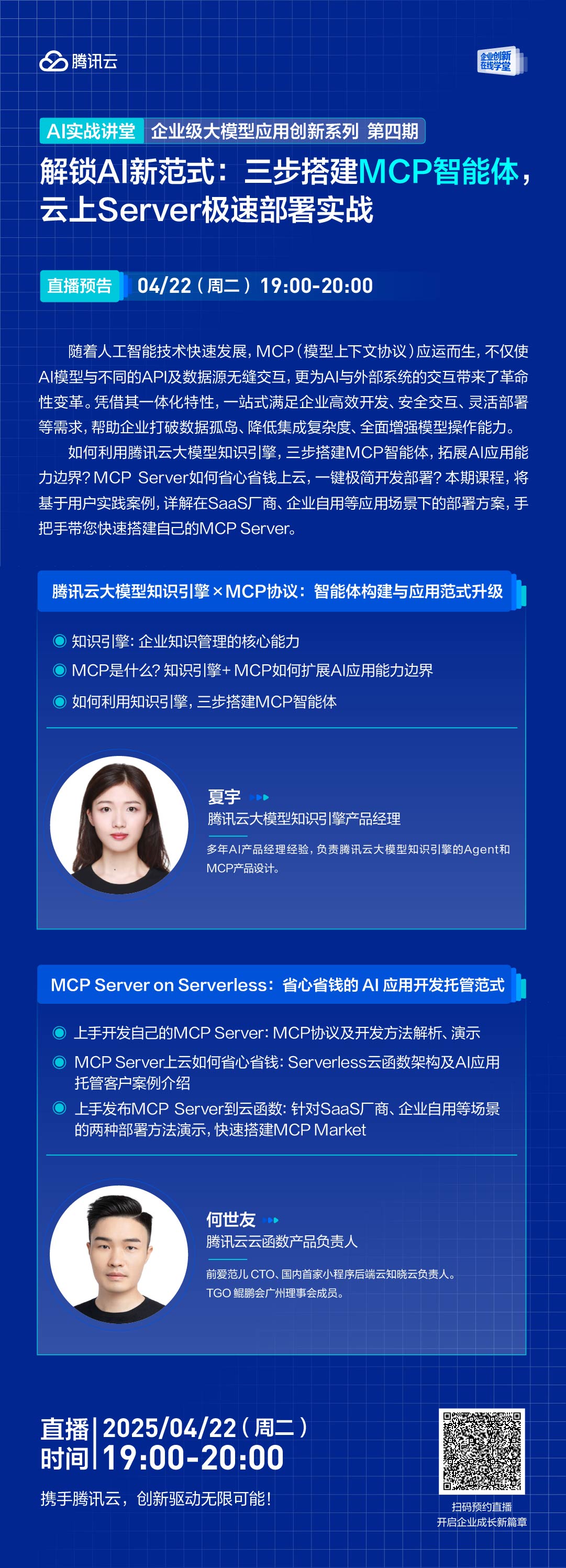 👇 扫码报名观看直播,腾讯云专家实操演示方式手把手带您快速搭建自己的MCP Server!