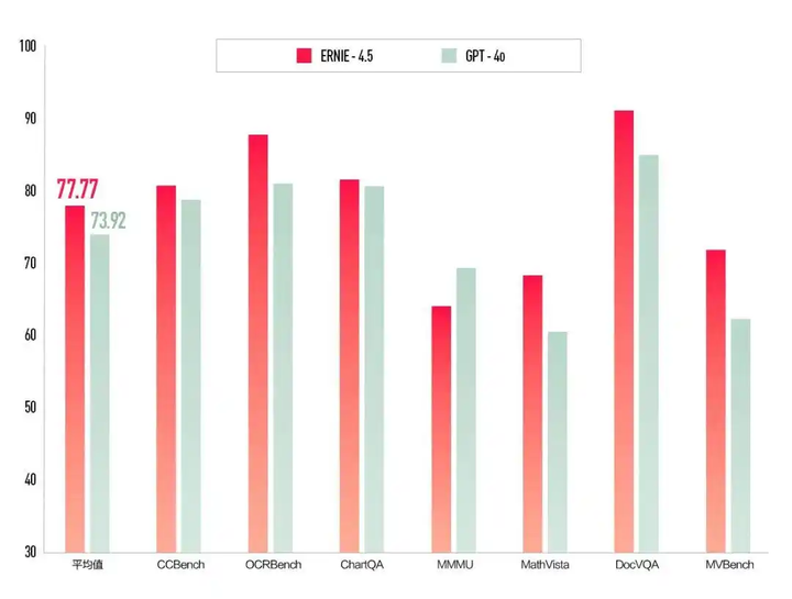 在平均值对比上,文心大模型4.5 的平均得分为 77.77,高于 GPT-4o 的 73.92,说明它整体表现更好。在各基准测试的对比上,文心大模型4.5在大多数基准测试上优于 GPT-4o,特别是在 DocVQA 和 MathVista 任务上表现明显更好。说明文心大模型 4.5 更加适用于广泛的多模态任务。
