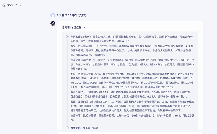 而文心大模型 X1,能明显应该就是对标 DeepSeek-R1 和 GPT-o1 模型,X1具备了“长思维链”能力,有更加深度的思考。比如我这里问了经典的问题:9.9 和 9.11 哪个大。