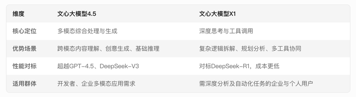 从定位来看,文心 4.5 模型主要擅长多模态能力,而 X1 模型则像 DeepSeek-R1 模型一样,主要擅长推理能力。