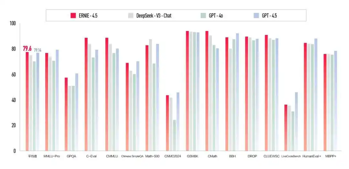 在纯文本能力上,文心大模型 4.5 整体的平均值能力在 79.6,超过了 DeepSeek-V3 和 GPT-4.5 模型。