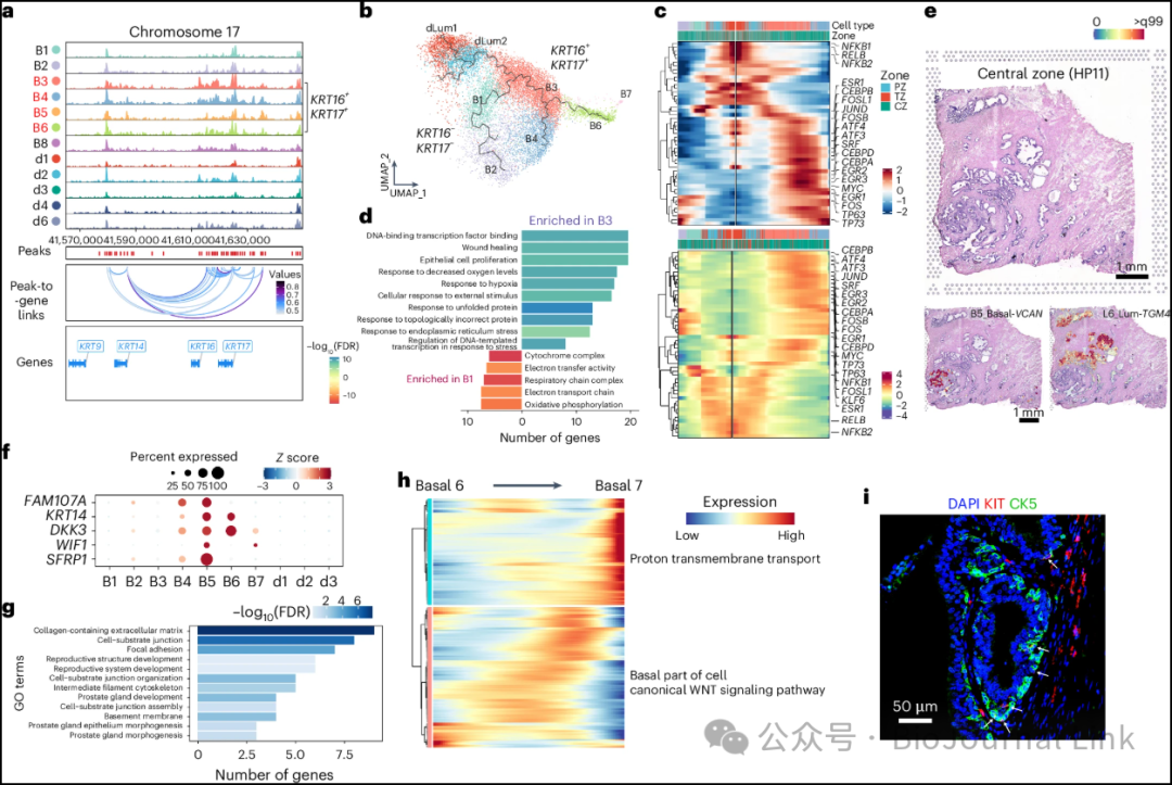◉ 基因可及性轨迹可视化显示了KRT16和KRT17的峰到基因链接。B3-B6用红色表示属于KRT16+KRT17+谱系的基底细胞亚群。KRT16和KRT17的基因可及性显示出谱系特异性特征。峰到基因链接是峰强度与相应基因表达水平之间的皮尔逊相关系数。◉ 通过单细胞RNA测序数据推断出的从柱状细胞到成熟基底细胞的单胞3轨迹。确定了两种分化方向。B5和B6代表KRT16+KRT17+分化谱系上的一个小的FOXI1+KIT+分支。◉ 伪热图显示了从柱状细胞到基底细胞在两个方向上的转录因子表达水平(上)和基序活性(下)的逐步变化。每个细胞中的转录因子基序活性由pySCENIC计算。◉ 条形图显示了scRNA-seq数据中B1和B3的富集GO术语。对B1和B3之间的差异表达基因进行了GO富集分析。◉ H&E染色显示了从HP11中央区域采集的空间转录组切片(顶部),以及由推断细胞比例着色的切片(底部)。◉ 点图显示了基底细胞和dLum细胞中选定标记物的表达。◉ 条形图显示了Basal 5-VCAN中的富集GO术语。对Basal 5-VCAN中上调的差异表达基因与所有其他基底细胞进行了GO富集分析。◉ 伪热图显示了从Basal 6到Basal 7细胞的差异表达基因表达的逐步变化。基因分为两簇。右侧标注了两个基因簇中富集的GO术语。◉ 多色IF染色显示了人类前列腺中KIT+CK5+基底细胞的存在。该实验重复了三次。H&E,苏木精和伊红染色。