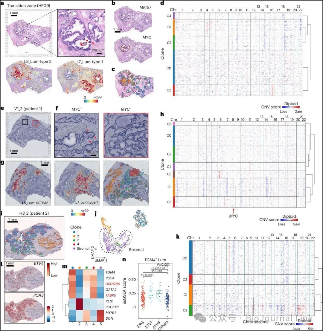 ◉ HP09过渡区切片的H&E染色(左上);HP09过渡区类型2腺体的CNA放大视图(右上);根据AddModuleScore计算的特征得分着色的空间转录组切片(下)。◉ 根据常规增殖标志物的表达水平对空间转录组切片进行着色。◉ 根据Leiden CNA聚类对空间转录组切片进行着色。每个点的CNA是通过inferCNV算法计算得出的。◉ 根据Leiden聚类分组的热图显示了HP09过渡区切片每个点的CNA。C0-C6,由Leiden聚类识别出的亚克隆0-6。◉ 患者1外周区样本的H&E染色切片。黑色方框和红色方框分别对应于图5e左侧图像中的黑色方框和红色方框内的部分。◉ 空间转录组切片中MYC+(左)和MYC-(右)前列腺腺体的放大H&E染色。◉ 根据AddModuleScore计算的特征得分(左和中)以及CNA聚类(右)对空间转录组切片进行着色。◉ 根据CNA聚类对空间转录组切片进行着色。每个点的CNA是通过inferCNV算法计算得出的。C0-C6,由Leiden聚类识别出的亚克隆0-6。◉ 根据Leiden聚类中的H3_2患者的CNA聚类对空间转录组切片进行着色。◉ 每个点的CNA聚类用UMAP着色。◉ 根据Leiden聚类分组的热图显示了每个点的CNA。C0-C3,由Leiden聚类识别出的亚克隆0-3。◉ 根据选定基因的表达水平对空间转录组切片进行着色。◉ 显示每个簇中选定基因的平均表达水平的热图。每个簇中的平均表达水平在可视化前转换成了行z分数。◉ 显示TCGA-PRAD中每个ETS-样本的TGM4+特征的箱线图。按分子亚型分组。ERG,n=152;ETV1,n=28;ETV4,n=14;其他,n=135。调整后的P值通过双侧Tukey检验计算得出。中央线代表中位数,箱子的边界表示四分位间距,须延伸至1.5倍四分位间距。Chr,染色体。