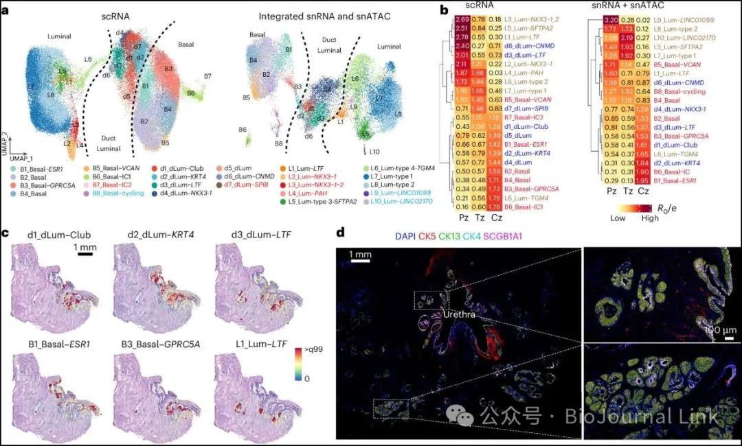 ◉ 概述前列腺上皮细胞的细胞和空间异质性。a, scRNA-seq(左)和整合的snRNA-seq和snATAC-seq(右)数据中上皮细胞的UMAP,按细胞亚群着色。底部的图注用红色表示仅由scRNA-seq捕获的细胞亚群,而用蓝色表示仅在snRNA-seq中发现的亚群。◉ 显示每个细胞亚组特定区域分布的R0/e值。R0/e > 1.1被认为是显著富集。◉ 由dLum细胞围绕尿道形成的特殊结构。c, 从HP05中央区(Cz)采样的空间转录组切片,按推断的细胞比例着色。◉ 围绕尿道的切片的多色IF染色。SCGB1A1+俱乐部细胞和CK4+dLum细胞主要位于顶端侧,而CK5+CK13+丘状基底细胞位于管腔的基底外侧。◉ 该实验重复了三次。Pz, 外周区;Tz, 过渡区。
