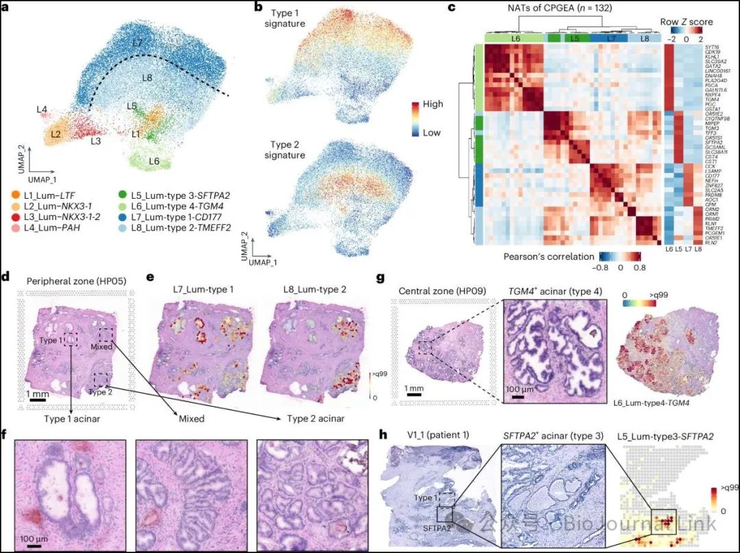 Para_01 亚簇分析揭示了八种亚群。 大多数管腔细胞主要分布在周围区和过渡区,而L6_Lum型4-TGM4细胞特异性地存在于中央区(图2b和图4a)。 L1亚群代表了dLum3-LTF细胞与腺泡细胞之间的过渡状态(图2c和扩展数据图2c、d)。 L2和L3的特点是核糖体丰度增加,线粒体丰度减少,并且高度表达与管腔细胞分化和发展相关的转录因子,如HOXB13、NKX3-1和FOXA1(参考文献26、27、28;补充图2a-c)。 L7、L8和L5管腔细胞的标记物标记了L2和L3细胞的不同子集,它们之间有明显的界限,表明存在独特的细胞状态(补充图2d)。 然而,缺乏亚型特异性标记物使得在组织切片上难以区分这些细胞(补充图2e)。 L4细胞显示出显著的个体特异性,在空间转录组数据中未被表征(补充图2f)。 Fig. 4: Identification of four different acinar cell types in the human prostate.