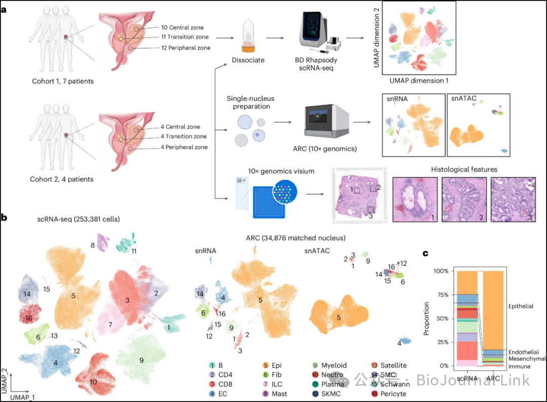 ◉ 队列1包括7名因膀胱癌接受根治性膀胱切除术患者的前列腺,每个前列腺根据解剖位置取样。所有样本均进行了BD Rhapsody单细胞核RNA测序。◉ 队列2由4名同样接受根治性膀胱切除术患者的前列腺组成,每位患者前列腺的外周区、移行区和中央区各取一个样本。这些样本随后进行了BD Rhapsody单细胞转录组测序、10x Genomics Multiome和10x Genomics Visium空间转录组测序。◉ 面板a使用BioRender.com创建。◉ b, 按主要细胞身份颜色编码的scRNA-seq(左)、snRNA-seq(中)和snATAC-seq(右)数据的UMAP图。◉ c, scRNA-seq和10x Multiome平台捕获的主要细胞类型的比例。ARC,调控因子和染色质分析;EC,内皮细胞;Epi,上皮细胞;Fib,成纤维细胞;ILC,先天淋巴细胞;SKMC,骨骼肌细胞。